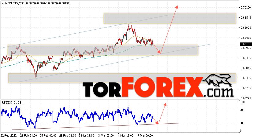 Таким образом, Форекс прогноз и аналитика NZD/USD на 9 марта 2022 предполагает попытку теста области поддержки вблизи уровня 0.6755. Откуда стоит ожидать продолжения роста котировок в область выше уровня 0.7015. Дополнительным сигналом в пользу подъёма выступит тест линии тренда на индикаторе относительной силы. Отменой варианта роста пары NZD/USD станет падение цены и пробой уровня 0.6705. В этом случае стоит ожидать продолжение снижения пары с потенциальной целью ниже уровня 0.6515.