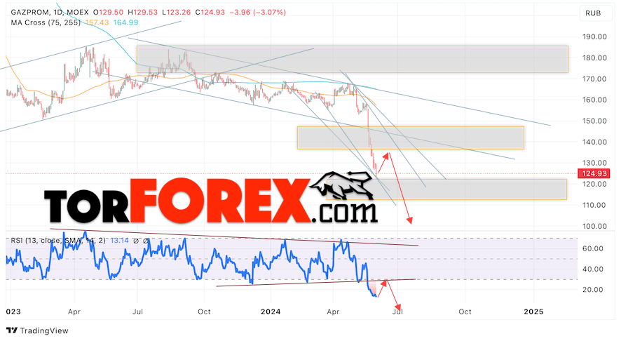 Дополнительным сигналом в пользу снижения котировок GAZP выступит тест линии сопротивления на индикаторе относительной силы. Вторым сигналом станет отбой от верхней границы медвежьего канала. Отменой варианта снижения акций Газпром на следующей торговой неделе станет сильный рост цен и пробой уровня 150.65. Это укажет на пробой области сопротивления и продолжение роста котировок GAZP в область выше уровня 135.05. Ожидать подтверждения падению котировок GAZP стоит с пробоем области поддержки и закрытием ниже уровня 120.05.