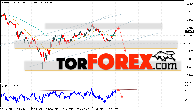 Таким образом, GBP/USD прогноз Форекс на 4 — 8 декабря 2023 предполагает попытку развития бычьей коррекции и теста уровня сопротивления вблизи области 1.2835. Откуда стоит ожидать продолжения падения валютной пары с целью ниже области 1.1545. Дополнительным сигналом в пользу снижения выступит тест линии тренда на индикаторе относительной силы. Отменой варианта падения пары Фунт Доллар станет сильный рост и пробой уровня 1.2985. В этом случае стоит ожидать продолжения подъёма пары с потенциальной целью выше уровня 1.3245.