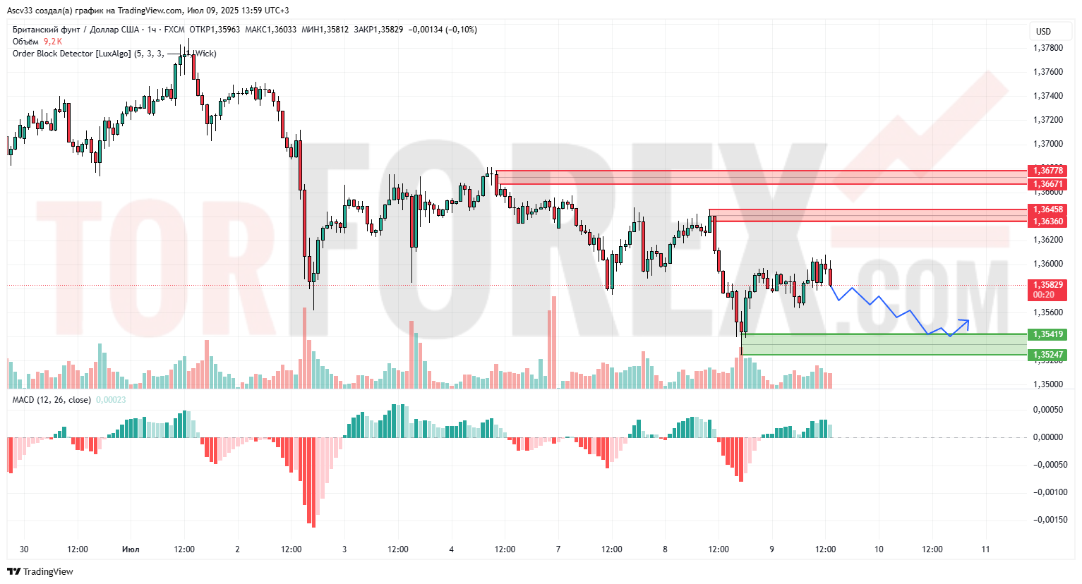 1.36360–1.36458 — активная зона предложения, откуда началось последнее нисходящее движение.