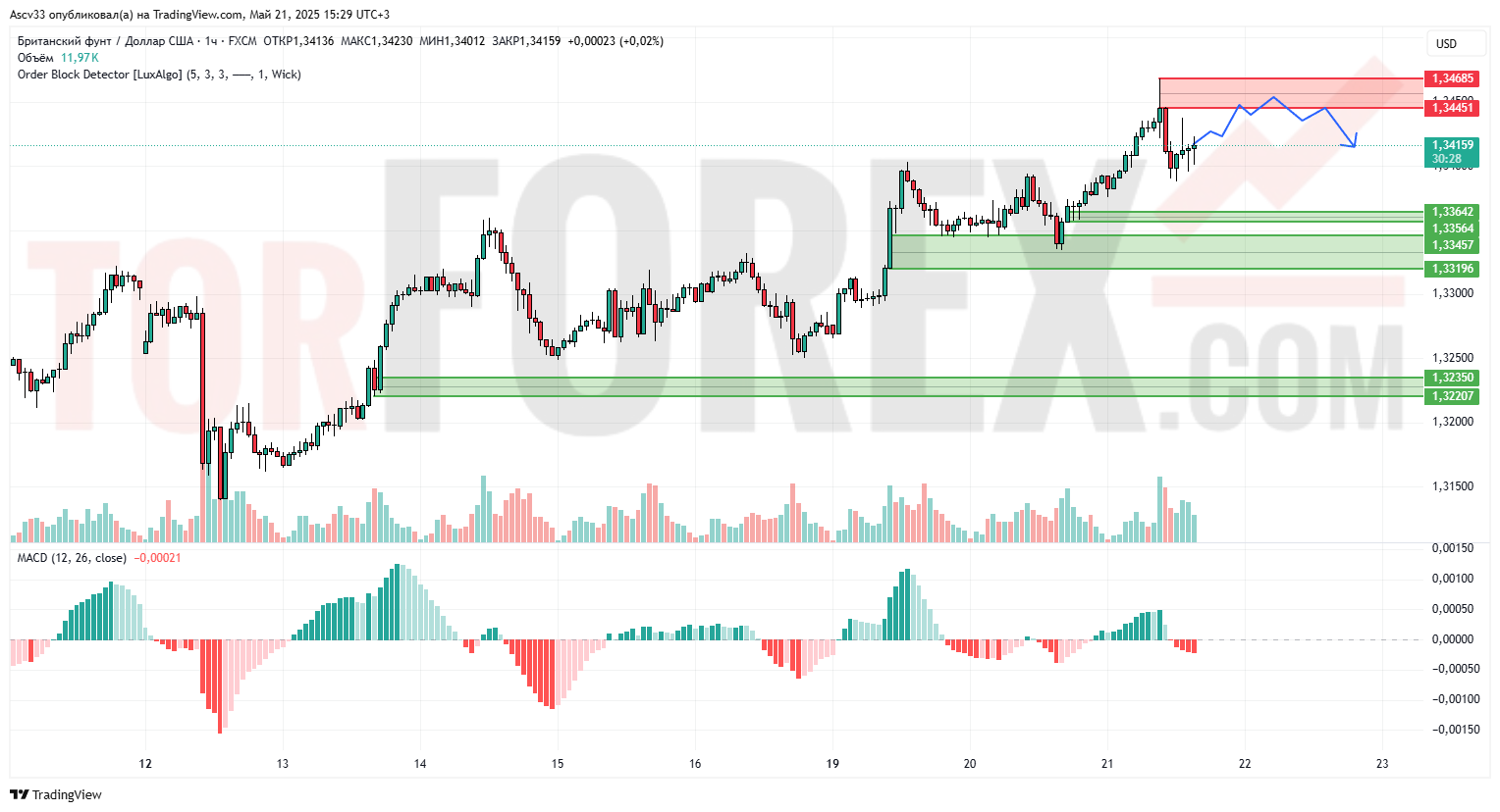 Пара GBP/USD подошла к верхней границе зоны предложения в районе 1,34450–1,34685 после устойчивого роста. На графике отмечается умеренное замедление импульса и формирование потенциального диапазона консолидации. Объёмы начинают снижаться, указывая на ослабление давления покупателей. MACD развернулся вблизи нулевой линии и демонстрирует отрицательную гистограмму, что может свидетельствовать о начале коррекции или как минимум о паузе в росте.