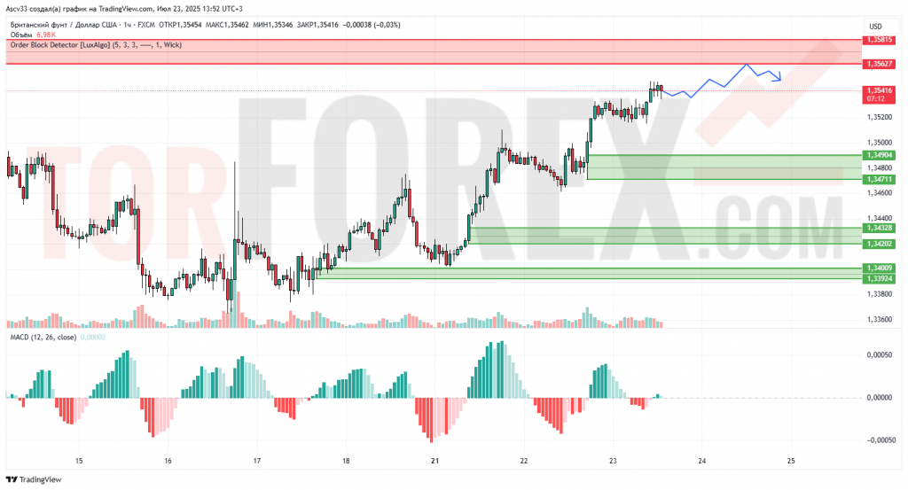 Вероятен откат от зоны сопротивления с движением в область 1.3490–1.3470. Если давление продавцов усилится, цена может протестировать более глубокую зону 1.3430. Пробой 1.3563 вверх отменит коррекционный сценарий и подтвердит продолжение восходящего тренда.