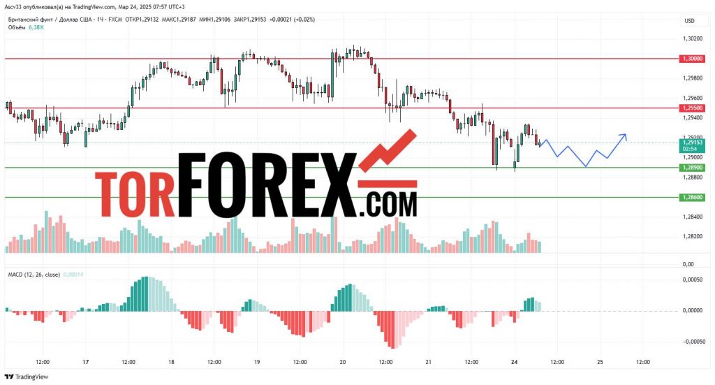 Ожидается, что GBP/USD будет находиться в диапазоне 1,2890–1,2950 в течение 24 марта. Пробой 1,2950 вверх подтвердит восходящее движение, тогда как закрепление ниже 1,2890 может усилить медвежьи настроения. Трейдерам рекомендуется обратить внимание на изменения курса вблизи этих ключевых уровней, так как их прорыв может значительно повлиять на дальнейшие действия по валютной паре.