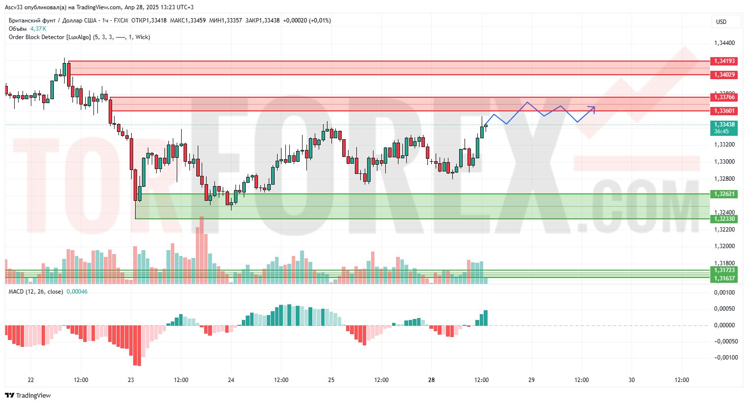 Ожидается консолидация в диапазоне 1.33601–1.3348 с попытками роста. Пробой выше 1.33766 усилит бычий импульс. Возврат ниже 1.32621 подтвердит окончание коррекции.