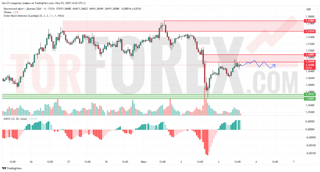 GBP/USD демонстрирует восстановление после падения и сейчас консолидируется у нижней границы зоны предложения 1.3666–1.3688. Импульс роста замедлился, и цена рисует фигуру, похожую на разворотную, вблизи важного сопротивления. Уровень объёма остаётся средним, а индикатор MACD находится в положительной зоне, но сигнализирует о возможной потере инерции.