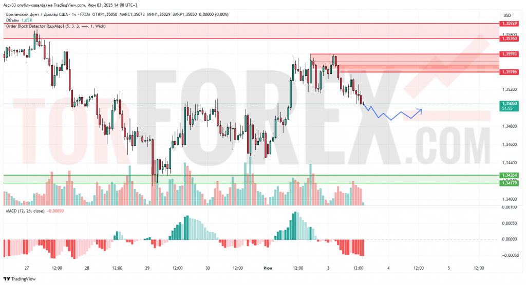 GBP/USD завершает фазу коррекции после неудачного теста зоны 1.35590–1.35390. Цена оттолкнулась вниз от сопротивления и приближается к области поддержки в районе 1.34800. Наблюдается снижение объемов на фоне ослабления бычьего импульса.