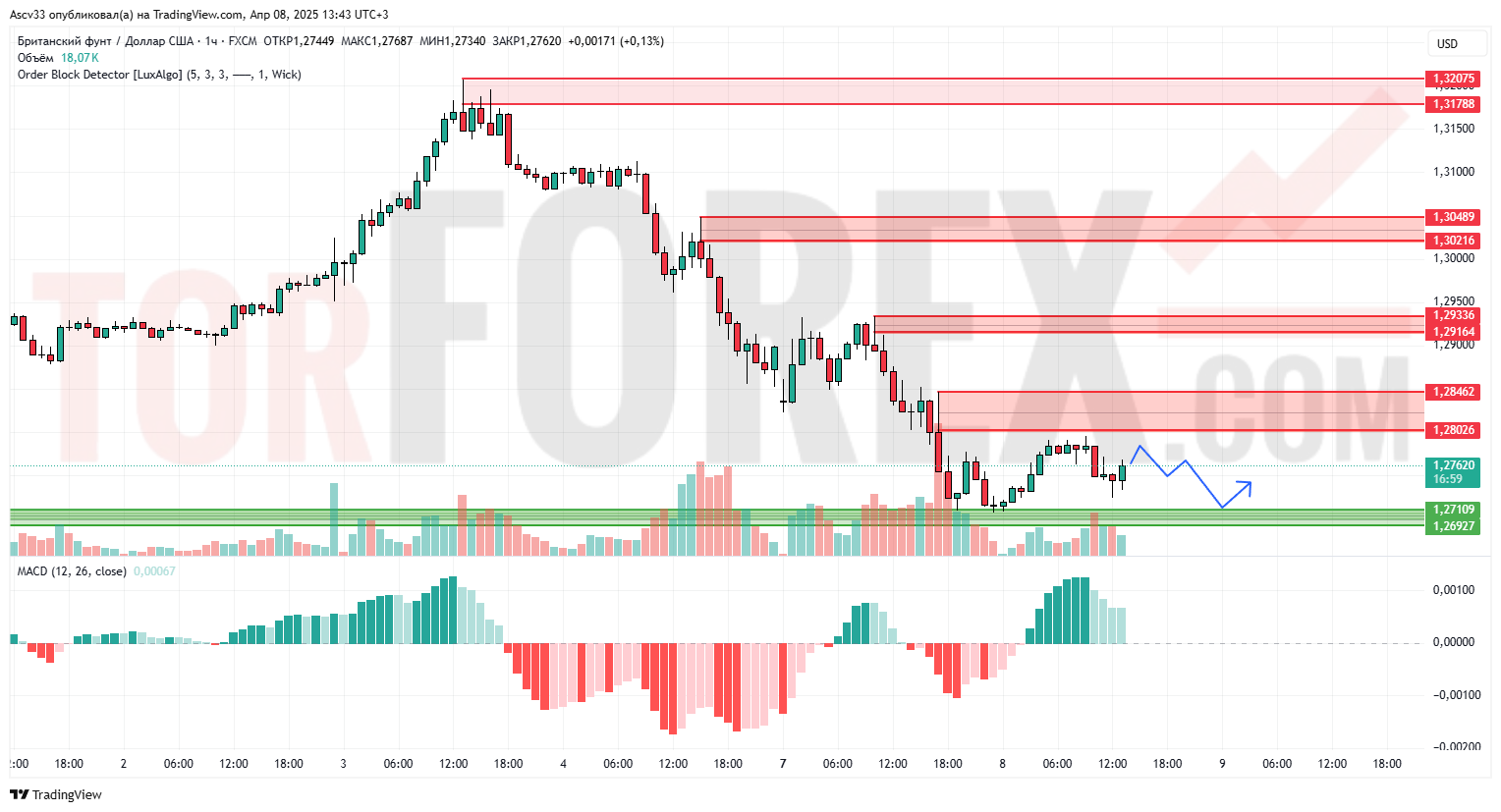 Пара GBP/USD корректируется после сильного нисходящего импульса от области 1,3048. На часовом графике наблюдается попытка формирования локального дна в районе 1,2710–1,2692, откуда произошёл краткосрочный отскок вверх. Тем не менее, структура остаётся слабой, и общее движение по-прежнему сохраняет медвежий уклон.