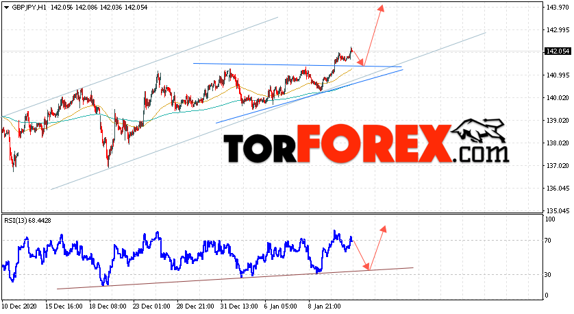Валютная пара Британский Фунт Японская Иена GBP/JPY продолжает движение в рамках роста и начала отработки модели ”Треугольник”. Скользящие средние указывают на наличие краткосрочной бычьей тенденции по паре. Цены ушли вверх от области между сигнальным линиями, что указывает на давление со стороны покупателей Британского Фунта против Японской Иены и потенциальное продолжение роста уже с текущих уровней. В момент публикации прогноза курс Фунта к Иене составляет 140.65. В рамках Форекс прогноза курса GBP/JPY на 14 января 2021 стоит ожидать попытку развития коррекции и тест уровня поддержки вблизи области 141.45. Далее, отскок и продолжение роста валютной пары Евро Иена. Потенциальной целью такого движения на Форекс выступает область выше уровня 144.05.