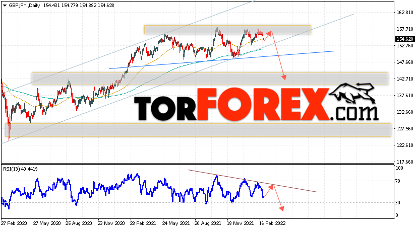 Дополнительным сигналом в пользу падения валютной пары Фунт Иена выступит тест линии тренда на индикаторе относительной силы. Вторым сигналом станет отскок от верхней границы разворотной модели ”Голова и плечи”. Отменой варианта снижения GBP/JPY станет сильный рост и пробой области 159.05. Это укажет на пробой области сопротивления и продолжение роста пары на Форекс с целью выше области 162.65. Подтверждением падению пары на текущей торговой неделе 28 февраля — 4 марта 2022 выступит пробой области поддержки и закрытие котировок ниже уровня 147.05, что укажет на завершение и начало отработки разворотной модели ”Голова и плечи”.