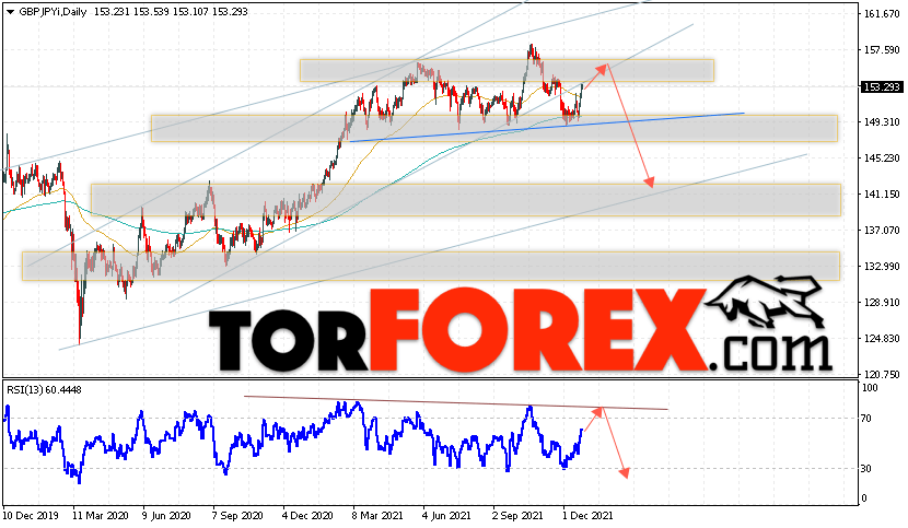 Дополнительным сигналом в пользу падения валютной пары Фунт Иена выступит тест линии тренда на индикаторе относительной силы. Вторым сигналом станет отскок от нижней границы бычьего канала. Отменой варианта снижения GBP/JPY станет сильный рост и пробой области 158.35. Это укажет на пробой области сопротивления и продолжение роста пары на Форекс с целью выше области 161.45. Подтверждением падению пары на текущей торговой неделе 27 — 31 декабря 2021 выступит пробой области поддержки и закрытие котировок ниже уровня 148.65, что укажет на начало отработки разворотной модели ”Голова и плечи”.