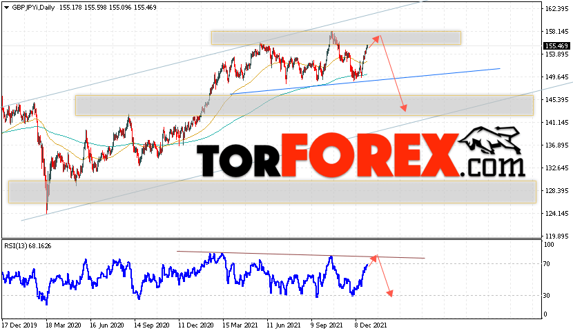 Дополнительным сигналом в пользу падения валютной пары Фунт Иена выступит тест линии тренда на индикаторе относительной силы. Вторым сигналом станет отскок от верхней границы разворотной модели ”Голова и плечи”. Отменой варианта снижения GBP/JPY станет сильный рост и пробой области 158.75. Это укажет на пробой области сопротивления и продолжение роста пары на Форекс с целью выше области 162.35. Подтверждением падению пары на текущей торговой неделе 3 — 7 января 2022 выступит пробой области поддержки и закрытие котировок ниже уровня 146.25, что укажет на завершение и начало отработки разворотной модели ”Голова и плечи”.