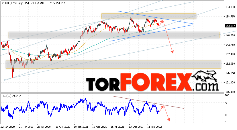 Дополнительным сигналом в пользу падения валютной пары Фунт Иена выступит тест линии тренда на индикаторе относительной силы. Вторым сигналом станет отскок от верхней границы модели ”Треугольник”. Отменой варианта снижения GBP/JPY станет сильный рост и пробой области 159.75. Это укажет на пробой области сопротивления и продолжение роста пары на Форекс с целью выше области 162.95. Подтверждением падению пары на текущей торговой неделе 7 — 11 марта 2022 выступит пробой области поддержки и закрытие котировок ниже уровня 147.75, что укажет на завершение и начало отработки модели ”Треугольник”.