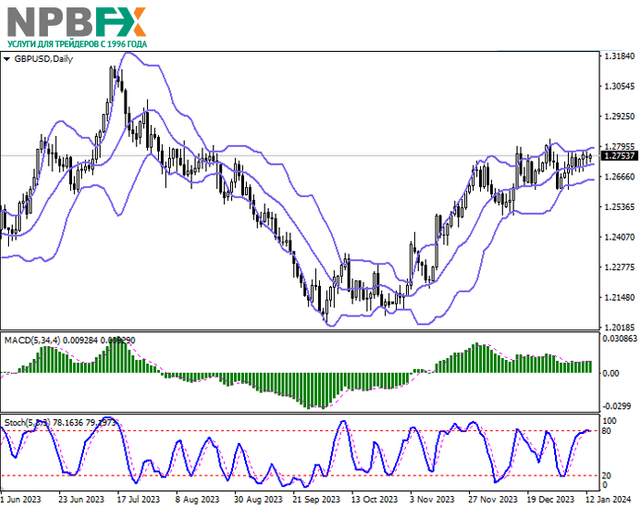 Пара GBP/USD незначительно укрепляется, тестируя отметку 1.2750 на пробой вверх. Активность на рынке остаётся достаточно низкой, поскольку рынки в США закрыты из-за празднования Дня Мартина Лютера Кинга. При этом инвесторы не спешат открывать новые позиции в преддверии завтрашней публикации отчёта по рынку труда Великобритании за ноябрь–декабрь.