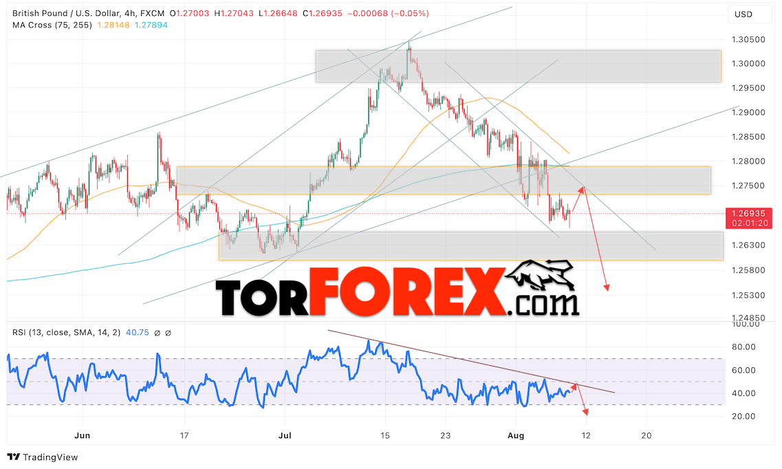 Таким образом, GBP/USD прогноз Британского Фунта на 9 августа 2024 предполагает попытку теста области сопротивления вблизи уровня 1.2745. Затем, продолжение падения с целью вблизи уровня 1.2530. Дополнительным сигналом в снижения подъёма Британского Фунта выступит тест линии сопротивления на индикаторе относительной силы (RSI). Отменой варианта падения станет сильный рост Британского Фунта против Доллара США и пробой области 1.2815. Это укажет на продолжение подъёма на Форекс пары с потенциальной целью выше уровня 1.2975.