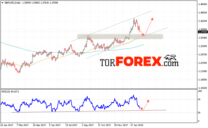 Таким образом, GBP USD прогноз Форекс на неделю 12 — 16 февраля 2018 предполагает попытку теста нижней границы канала вблизи 1.3550, откуда стоит ожидать продолжения роста пары, дополнительным сигналом в пользу роста выступит тест линии поддержки на индикаторе относительной силы, отменой варианта роста пары Фунт Доллар выступит пробой области 1.3350.