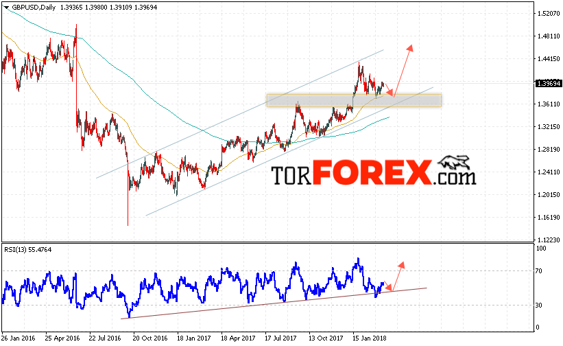 Таким образом, GBP/USD прогноз Форекс на неделю 19 — 23 марта 2018 предполагает попытку теста области поддержки вблизи уровня 1.3750, откуда стоит ожидать продолжения роста пары с целью выше области 1.4550, дополнительным сигналом в пользу роста выступит тест линии поддержки на индикаторе относительной силы, отменой варианта роста пары Фунт Доллар выступит пробой области 1.3450.