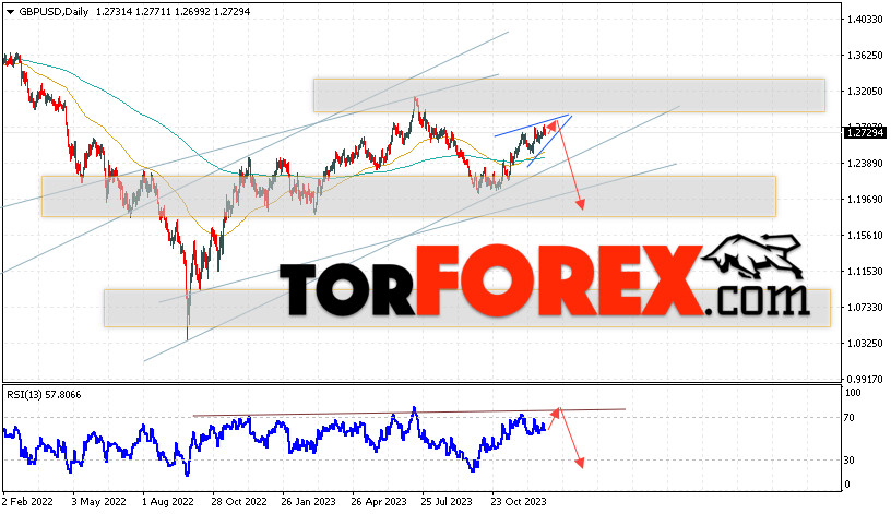 Таким образом, GBP/USD прогноз Форекс на 1 — 5 января 2024 предполагает попытку развития бычьей коррекции и теста уровня сопротивления вблизи области 1.2825. Откуда стоит ожидать продолжения падения валютной пары с целью ниже области 1.1845. Дополнительным сигналом в пользу снижения выступит тест линии тренда на индикаторе относительной силы. Отменой варианта падения пары Фунт Доллар станет сильный рост и пробой уровня 1.2985. В этом случае стоит ожидать продолжения подъёма пары с потенциальной целью выше уровня 1.3275.
