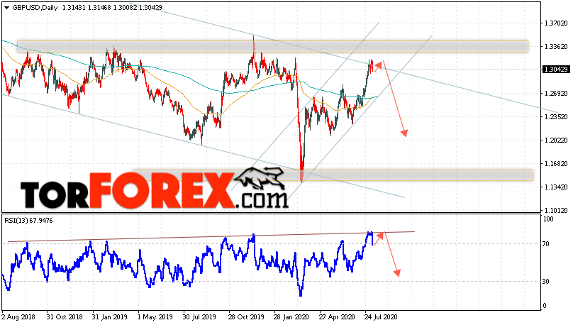 Дополнительным сигналом в пользу падения Британского Фунта выступит тест линии сопротивления тренда на индикаторе относительной силы. Вторым сигналом станет пробой нижней границы восходящего канала. Отменой варианта падения пары GBP/USD на текущей торговой неделе 10 — 14 августа 2020 станет сильный рост и пробой области 1.3455. Это укажет на пробой области сопротивления и продолжение роста в область выше уровня 1.4525. Подтверждением падения валютной GBP/USD выступит пробой области поддержки и закрытие цен ниже уровня 1.2505, это укажет на пробой нижней границы восходящего канала.