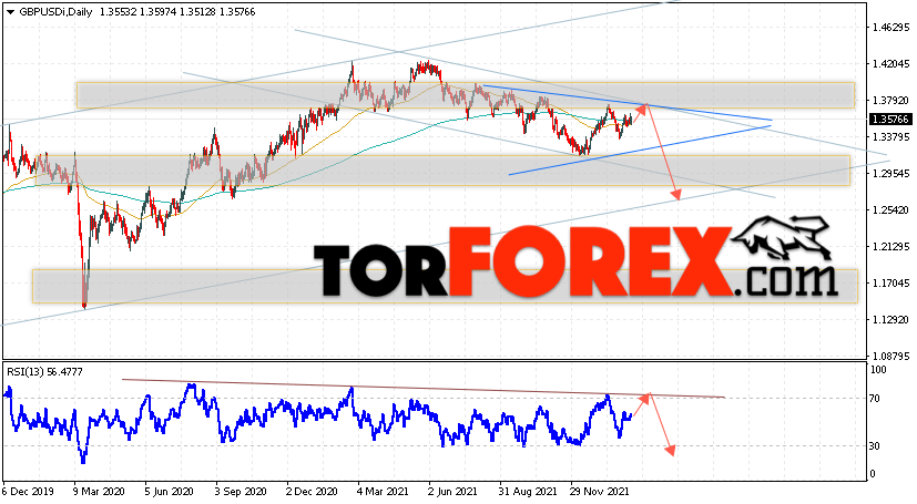 Таким образом, GBP/USD прогноз Форекс на 14 — 18 февраля 2022 предполагает попытку подъёма и теста уровня сопротивления вблизи области 1.3635. Откуда стоит ожидать продолжения падения валютной пары с целью выше области 1.2565. Дополнительным сигналом в пользу снижения выступит тест линии тренда на индикаторе относительной силы. Отменой варианта падения пары Фунт Доллар станет сильный рост и пробой уровня 1.3975. В этом случае стоит ожидать продолжения подъёма пары с потенциальной целью выше уровня 1.4265.