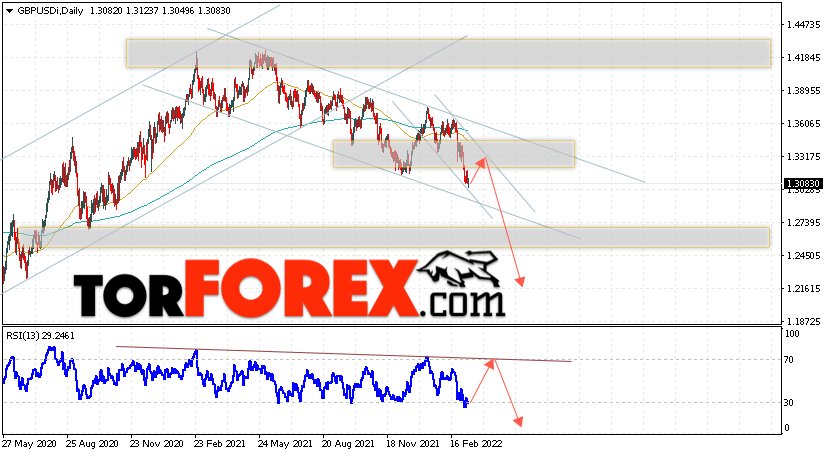 Таким образом, GBP/USD прогноз Форекс на 14 — 18 марта 2022 предполагает попытку подъёма и теста уровня сопротивления вблизи области 1.3295. Откуда стоит ожидать продолжения падения валютной пары с целью выше области 1.2165. Дополнительным сигналом в пользу снижения выступит тест линии тренда на индикаторе относительной силы. Отменой варианта падения пары Фунт Доллар станет сильный рост и пробой уровня 1.3725. В этом случае стоит ожидать продолжения подъёма пары с потенциальной целью выше уровня 1.4245.