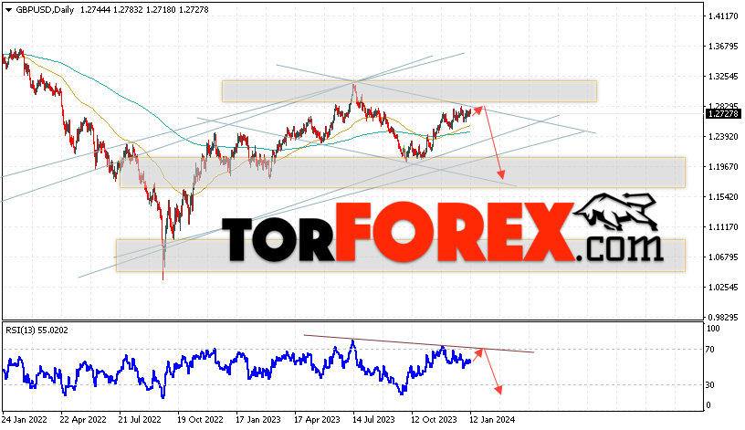 Дополнительным сигналом в пользу снижения Британского Фунта выступит тест линии сопротивления на индикаторе относительной силы. Вторым сигналом станет отскок от верхней границы разворотной модели «Двойная вершина». Отменой варианта падения пары GBP/USD на текущей торговой неделе 15 — 19 января 2024 станет сильный рост котировок и пробой области 1.3195. Это укажет на пробой области сопротивления и продолжение роста в область выше уровня 1.3425. Подтверждением падению валютной GBP/USD выступит пробой области поддержки и закрытие цены ниже уровня 1.2335, что укажет на пробой нижней границы бычьего канала.