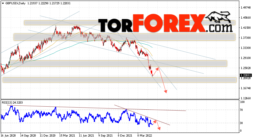 Дополнительным сигналом в пользу падения Британского Фунта выступит тест линии сопротивления на индикаторе относительной силы. Вторым сигналом станет отскок от верхней границы нисходящего канала. Отменой варианта снижения пары GBP/USD на текущей торговой неделе 16 — 20 мая 2022 станет сильный рост и пробой области 1.2825. Это укажет на пробой области сопротивления и продолжение роста в область выше уровня 1.3175. Подтверждением падения валютной GBP/USD выступит пробой области поддержки и закрытие цены ниже уровня 1.2035.