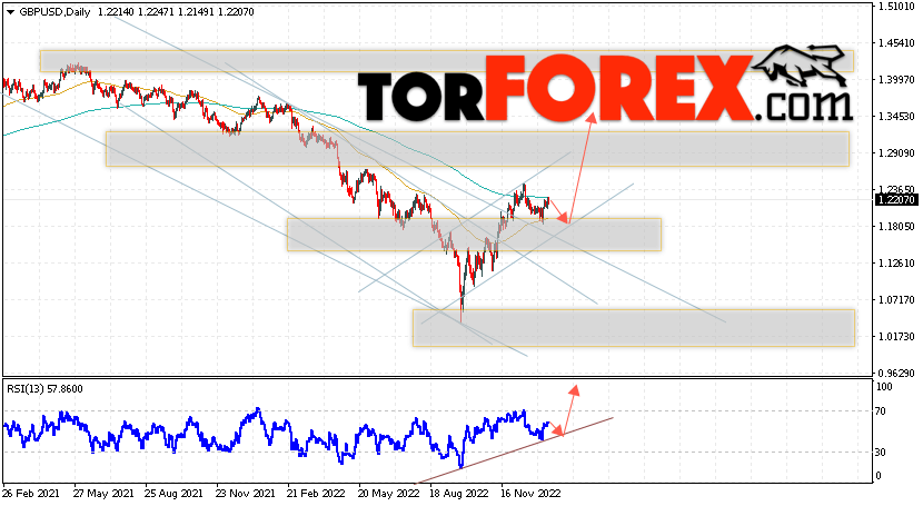 Таким образом, GBP/USD прогноз Форекс на 16 — 20 января 2023 предполагает попытку подъёма и теста уровня поддержки вблизи области 1.1795. Откуда стоит ожидать продолжения роста валютной пары с целью ниже области 1.3465. Дополнительным сигналом в пользу подъёма выступит тест линии тренда на индикаторе относительной силы. Отменой варианта роста пары Фунт Доллар станет падение и пробой уровня 1.1645. В этом случае стоит ожидать продолжения снижения пары с потенциальной целью ниже уровня 1.1125.