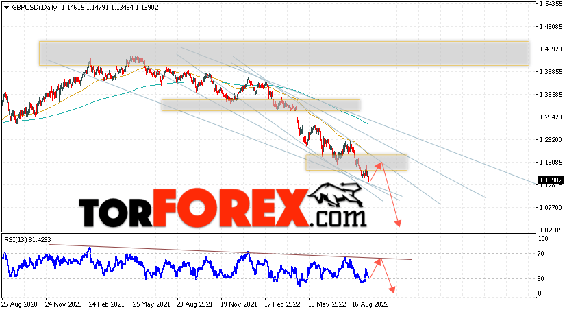 Таким образом, GBP/USD прогноз Форекс на 19 — 23 сентября 2022 предполагает попытку подъёма и теста уровня сопротивления вблизи области 1.1805. Откуда стоит ожидать продолжения падения валютной пары с целью выше области 1.0285. Дополнительным сигналом в пользу снижения выступит тест нисходящей линии тренда на индикаторе относительной силы. Отменой варианта падения пары Фунт Доллар станет сильный рост и пробой уровня 1.2055. В этом случае стоит ожидать продолжения подъёма пары с потенциальной целью выше уровня 1.2475.