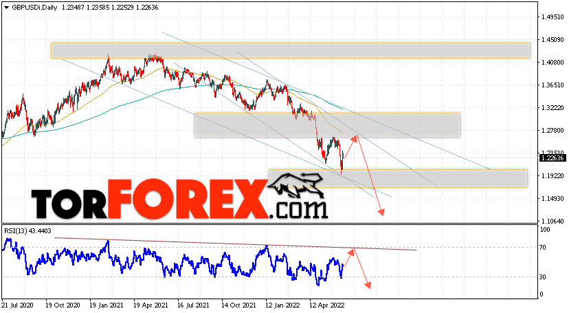 Таким образом, GBP/USD прогноз Форекс на 20 — 24 июня 2022 предполагает попытку подъёма и теста уровня сопротивления вблизи области 1.2495. Откуда стоит ожидать продолжения падения валютной пары с целью выше области 1.1375. Дополнительным сигналом в пользу снижения выступит тест линии тренда на индикаторе относительной силы. Отменой варианта падения пары Фунт Доллар станет сильный рост и пробой уровня 1.3025. В этом случае стоит ожидать продолжения подъёма пары с потенциальной целью выше уровня 1.3375.
