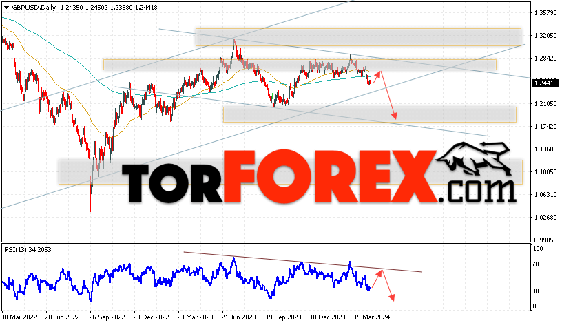 Таким образом, GBP/USD прогноз Форекс на 22 — 26 апреля 2024 предполагает попытку развития бычьей коррекции и теста уровня сопротивления вблизи области 1.2535. Откуда стоит ожидать продолжения падения валютной пары с целью ниже области 1.1745. Дополнительным сигналом в пользу снижения выступит тест линии тренда на индикаторе относительной силы. Отменой варианта падения пары Фунт Доллар станет сильный рост и пробой уровня 1.2955. В этом случае стоит ожидать продолжения подъёма пары с потенциальной целью выше уровня 1.3275.