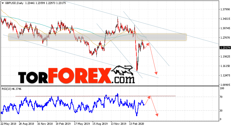 Таким образом, GBP/USD прогноз Форекс на 27 апреля — 1 мая 2020 предполагает попытку теста уровня сопротивления вблизи области 1.2565. Откуда стоит ожидать продолжения падения пары с целью ниже области 1.1245. Дополнительным сигналом в пользу падения выступит тест линии тренда на индикаторе относительной силы. Отменой варианта снижения пары Фунт Доллар станет сильный рост и пробой уровня 1.3155. В этом случае стоит ожидать продолжения роста пары с потенциальной целью выше уровня 1.3425.