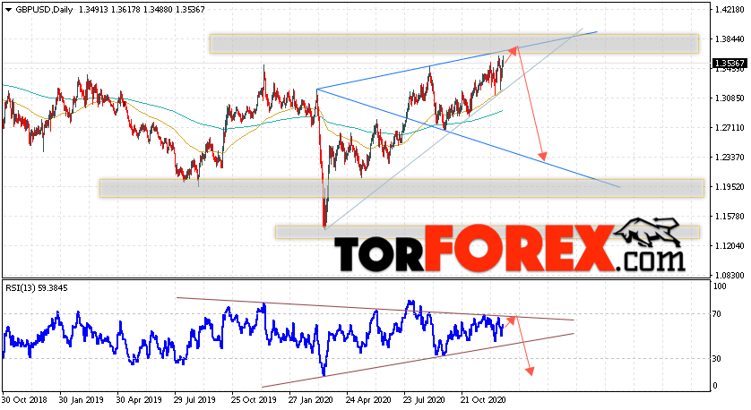 Таким образом, GBP/USD прогноз Форекс на 28 декабря 2020 — 1 января 2021 предполагает попытку роста и теста уровня сопротивления вблизи области 1.3685. Откуда стоит ожидать продолжения снижения валютной пары с целью ниже области 1.2335. Дополнительным сигналом в пользу падения выступит тест линии тренда на индикаторе относительной силы. Отменой варианта снижения пары Фунт Доллар станет сильный рост и пробой уровня 1.4095. В этом случае стоит ожидать продолжения роста пары с потенциальной целью выше уровня 1.4475.