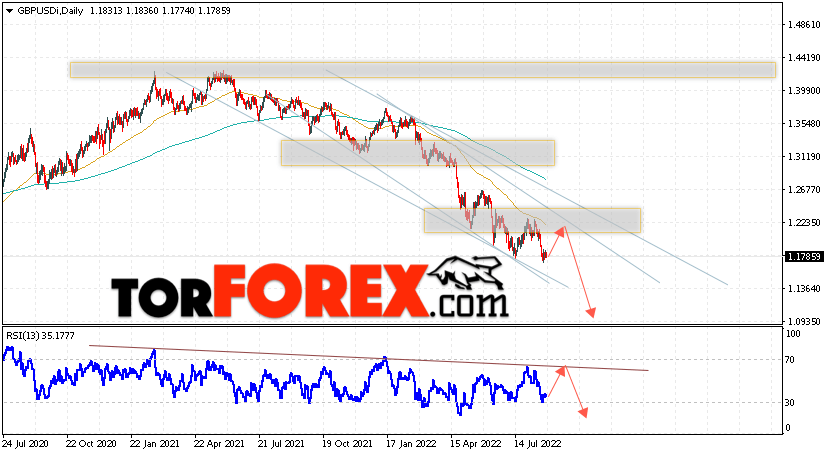 Таким образом, GBP/USD прогноз Форекс на 29 августа — 2 сентября 2022 предполагает попытку подъёма и теста уровня сопротивления вблизи области 1.2085. Откуда стоит ожидать продолжения падения валютной пары с целью выше области 1.0905. Дополнительным сигналом в пользу снижения выступит тест линии тренда на индикаторе относительной силы. Отменой варианта падения пары Фунт Доллар станет сильный рост и пробой уровня 1.2665. В этом случае стоит ожидать продолжения подъёма пары с потенциальной целью выше уровня 1.2985.
