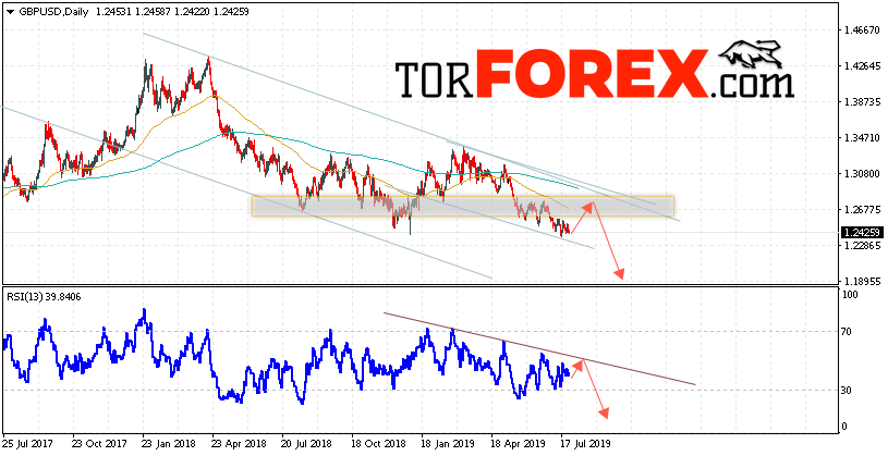 Таким образом, GBP/USD прогноз Форекс на 29 июля — 2 августа 2019 предполагает попытку теста уровня сопротивления вблизи области 1.2675. Откуда стоит ожидать продолжения падения пары с целью ниже области 1.1895. Дополнительным сигналом в пользу снижения выступит тест линии нисходящего тренда на индикаторе относительной силы. Отменой варианта падения пары Фунт Доллар станет сильный рост и пробой уровня 1.2855. В этом случае стоит ожидать продолжения роста пары с потенциальной целью выше уровня 1.3165.