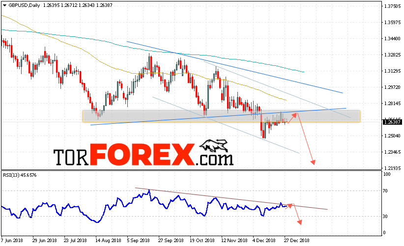 Таким образом, GBP/USD прогноз Форекс на 31 декабря — 4 января 2019 предполагает попытку теста уровня сопротивления вблизи области 1.2725. Откуда стоит ожидать продолжения падения пары с целью ниже области 1.2195. Дополнительным сигналом в пользу снижения выступит тест линии тренда на индикаторе относительной силы. Отменой варианта падения пары Фунт Доллар станет сильный рост и пробой уровня 1.3000. В этом случае стоит ожидать продолжения роста пары.