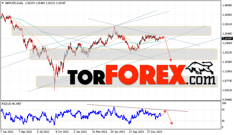 Дополнительным сигналом в пользу снижения Британского Фунта выступит тест линии сопротивления на индикаторе относительной силы. Вторым сигналом станет отскок от верхней границы разворотной модели «Двойная вершина». Отменой варианта падения пары GBP/USD на текущей торговой неделе 4 — 8 марта 2024 станет сильный рост котировок и пробой области 1.3275. Это укажет на пробой области сопротивления и продолжение роста в область выше уровня 1.3685. Подтверждением падению валютной GBP/USD выступит пробой области поддержки и закрытие цены ниже уровня 1.2385, что укажет на пробой нижней границы бычьего канала.