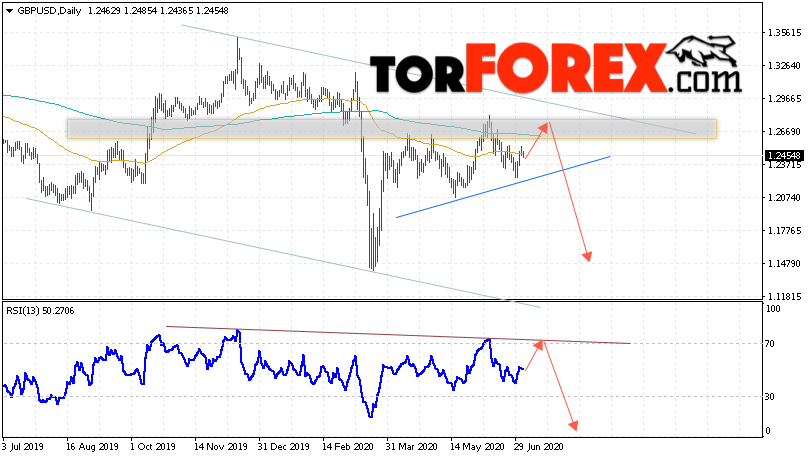 Таким образом, GBP/USD прогноз Форекс на 6 — 10 июля 2020 предполагает попытку теста уровня сопротивления вблизи области 1.2715. Откуда стоит ожидать продолжения падения пары с целью ниже области 1.1420. Дополнительным сигналом в пользу падения выступит тест линии тренда на индикаторе относительной силы. Отменой варианта снижения пары Фунт Доллар станет сильный рост и пробой уровня 1.3075. В этом случае стоит ожидать продолжения роста пары с потенциальной целью выше уровня 1.3625.