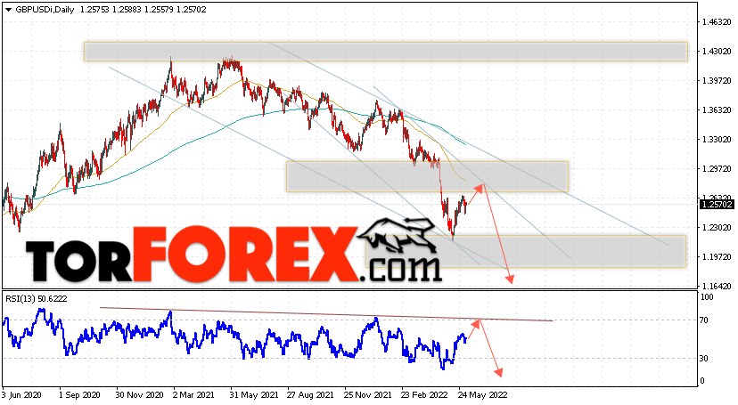 Таким образом, GBP/USD прогноз Форекс на 6 — 10 июня 2022 предполагает попытку подъёма и теста уровня сопротивления вблизи области 1.2655. Откуда стоит ожидать продолжения падения валютной пары с целью выше области 1.1645. Дополнительным сигналом в пользу снижения выступит тест линии тренда на индикаторе относительной силы. Отменой варианта падения пары Фунт Доллар станет сильный рост и пробой уровня 1.3045. В этом случае стоит ожидать продолжения подъёма пары с потенциальной целью выше уровня 1.3335.