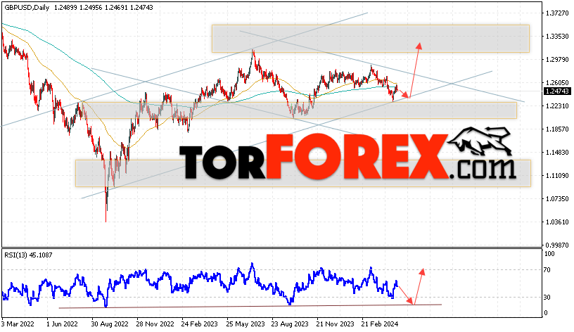 Таким образом, GBP/USD прогноз Форекс на 6 — 10 мая 2024 предполагает попытку развития медвежьей коррекции и теста уровня поддержки вблизи области 1.2275. Откуда стоит ожидать продолжения роста валютной пары с целью выше области 1.3075. Дополнительным сигналом в пользу подъёма выступит тест линии тренда на индикаторе относительной силы. Отменой варианта роста пары Фунт Доллар станет падение и пробой уровня 1.2045. В этом случае стоит ожидать продолжения снижения пары с потенциальной целью ниже уровня 1.1765.