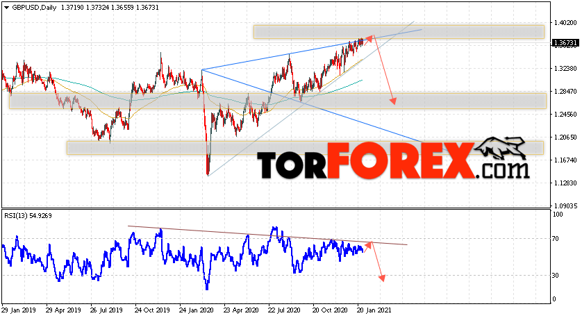 Таким образом, GBP/USD прогноз Форекс на неделю 1 — 5 февраля 2021 предполагает попытку роста и теста уровня сопротивления вблизи области 1.3715. Откуда стоит ожидать продолжения снижения валютной пары с целью ниже области 1.2465. Дополнительным сигналом в пользу падения выступит тест линии тренда на индикаторе относительной силы. Отменой варианта снижения пары Фунт Доллар станет сильный рост и пробой уровня 1.4055. В этом случае стоит ожидать продолжения роста пары с потенциальной целью выше уровня 1.4525.