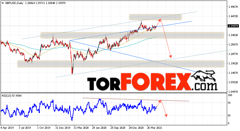 Таким образом, GBP/USD прогноз Форекс на неделю 10 — 14 мая 2021 предполагает попытку роста и теста уровня сопротивления вблизи области 1.4165. Откуда стоит ожидать продолжения падения валютной пары с целью ниже области 1.2255. Дополнительным сигналом в пользу снижения выступит тест линии тренда на индикаторе относительной силы. Отменой варианта падения пары Фунт Доллар станет сильный рост и пробой уровня 1.4565. В этом случае стоит ожидать продолжения подъёма пары с потенциальной целью выше уровня 1.5205.