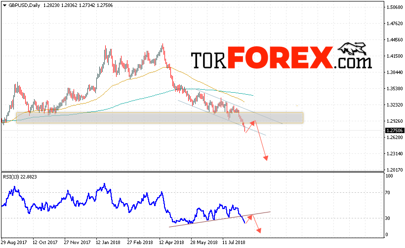Таким образом, GBP/USD прогноз Форекс на неделю 13 — 17 августа 2018 предполагает попытку теста уровня сопротивления вблизи области 1.2925, откуда стоит ожидать продолжения падения пары с целью ниже области 1.2250, дополнительным сигналом в пользу падения выступит тест линии тренда на индикаторе относительной силы, отменой варианта снижения пары Фунт Доллар станет сильный рост и пробой уровня 1.3150.