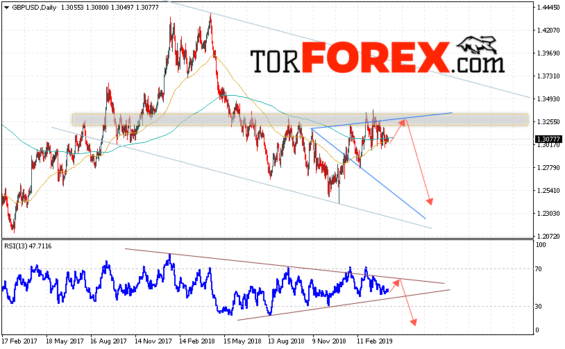 Таким образом, GBP/USD прогноз Форекс на неделю 15 — 19 апреля 2019 предполагает попытку теста уровня сопротивления вблизи области 1.3255. Откуда стоит ожидать продолжения падения пары с целью ниже области 1.2365. Дополнительным сигналом в пользу снижения выступит тест линии тренда на индикаторе относительной силы. Отменой варианта падения пары Фунт Доллар станет сильный рост и пробой уровня 1.3545. В этом случае стоит ожидать продолжения роста пары с потенциальной целью выше уровня 1.3750.