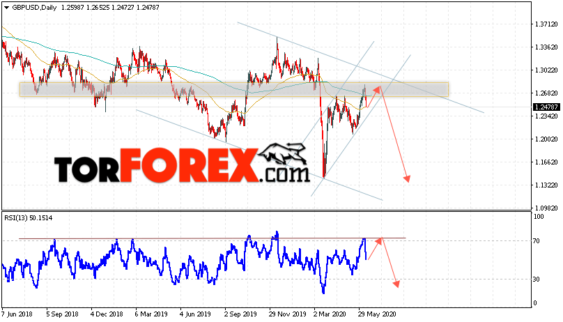 Дополнительным сигналом в пользу падения Британского Фунта выступит тест линии тренда на индикаторе относительной силы. Вторым сигналом станет отскок от верхней границы нисходящего канала. Отменой варианта падения пары GBP/USD на текущей торговой неделе 15 — 19 июня 2020 станет сильный рост и пробой области 1.3105. Это укажет на пробой области сопротивления и продолжение роста в область выше уровня 1.3625. Подтверждением падения валютной GBP/USD выступит пробой области поддержки и закрытие цен ниже уровня 1.2345, что укажет на выход цен за пределы восходящего канала.