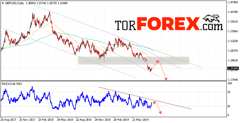 В пользу падения Британского Фунта выступит тест нисходящей линии сопротивления на индикаторе относительной силы. Вторым сигналом выступит отскок от верхней границы нисходящего канала. Отменой варианта снижения пары GBP/USD на текущей торговой неделе 19 — 23 августа 2019 станет сильный рост и пробой области 1.2495. Это укажет на пробой верхней границы канала и продолжения роста в область выше уровня 1.2955. Подтверждением падения GBP/USD выступит пробой области поддержки и закрытие ниже уровня 1.1965.