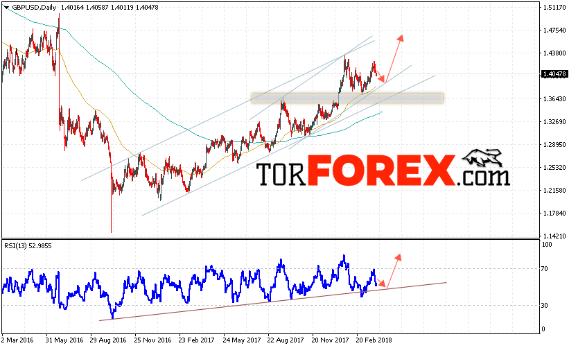 Таким образом, GBP/USD прогноз Форекс на неделю 2 — 6 апреля 2018 предполагает попытку теста нижней границы восходящего канала вблизи уровня 1.3960, откуда стоит ожидать продолжения роста пары с целью выше области 1.4650, дополнительным сигналом в пользу роста выступит тест линии тренда на индикаторе относительной силы, отменой варианта роста пары Фунт Доллар станет пробой уровня 1.3600.