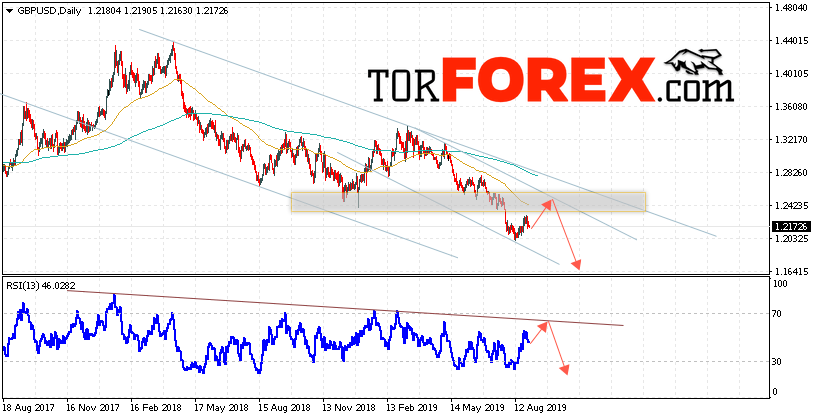 Таким образом, GBP/USD прогноз Форекс на 2 — 6 сентября 2019 предполагает попытку теста уровня сопротивления вблизи области 1.2435. Откуда стоит ожидать продолжения падения пары с целью ниже области 1.1645. Дополнительным сигналом в пользу снижения выступит тест линии нисходящего тренда на индикаторе относительной силы. Отменой варианта падения пары Фунт Доллар станет сильный рост и пробой уровня 1.2585. В этом случае стоит ожидать продолжения роста пары с потенциальной целью выше уровня 1.3165.