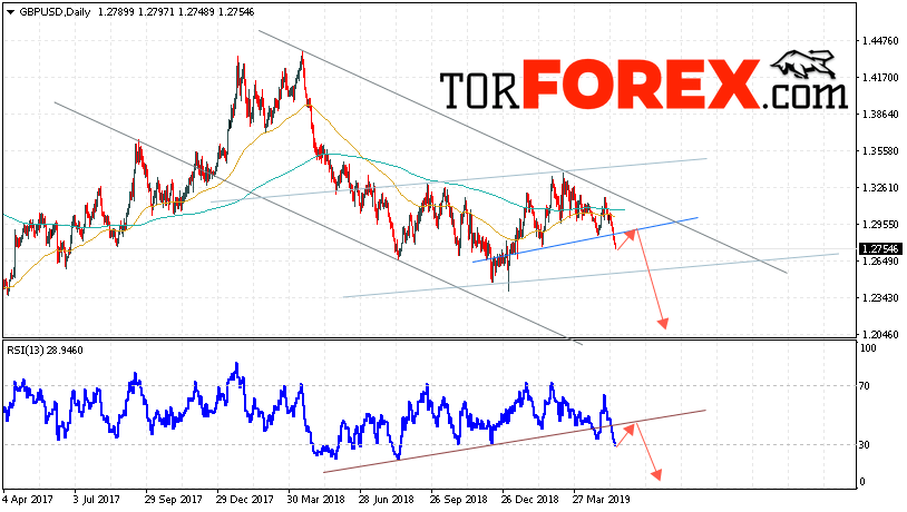 В пользу падения Британского Фунта выступит тест нисходящей линии тренда на индикаторе относительной силы. Вторым сигналом выступит отскок от линии «Шеи» разворотной модели «Голова и плечи». Отменой варианта снижения пары GBP/USD на текущей торговой неделе 20 — 24 мая 2019 станет сильный рост и пробой области 1.3215. Это укажет на пробой верхней границы канала и продолжения роста в область выше уровня 1.3750. Подтверждением падения GBP/USD выступит пробой области поддержки и закрытие ниже уровня 1.2745.