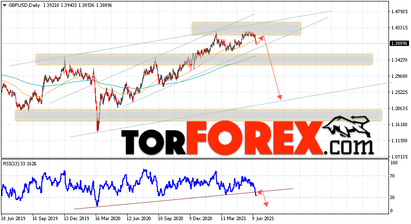 Таким образом, GBP/USD прогноз Форекс на неделю 21 — 25 июня 2021 предполагает попытку роста и теста уровня сопротивления вблизи области 1.4005. Откуда стоит ожидать продолжения падения валютной пары с целью ниже области 1.2455. Дополнительным сигналом в пользу снижения выступит тест линии тренда на индикаторе относительной силы. Отменой варианта падения пары Фунт Доллар станет сильный рост и пробой уровня 1.4565. В этом случае стоит ожидать продолжения подъёма пары с потенциальной целью выше уровня 1.5005.