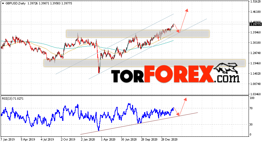 Таким образом, GBP/USD прогноз Форекс на неделю 22 — 26 февраля 2021 предполагает попытку коррекции и теста уровня поддержки вблизи области 1.3535. Откуда стоит ожидать продолжения подъёма валютной пары с целью выше области 1.4645. Дополнительным сигналом в пользу роста выступит тест линии тренда на индикаторе относительной силы. Отменой варианта подъёма пары Фунт Доллар станет падение и пробой уровня 1.3085. В этом случае стоит ожидать продолжения снижения пары с потенциальной целью ниже уровня 1.2035.